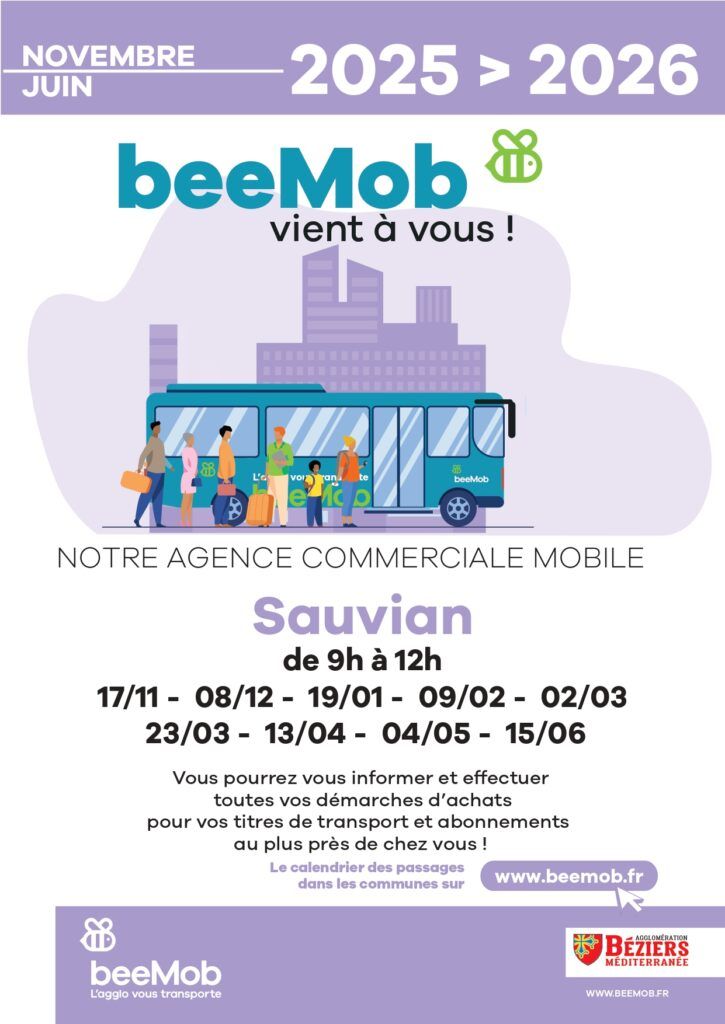 Retrouvez ci-dessous l’affiche informative concernant le passage de l’agence commerciale mobile beeMob à Sauvian, pour la période de novembre 2025 à juin 2026.
