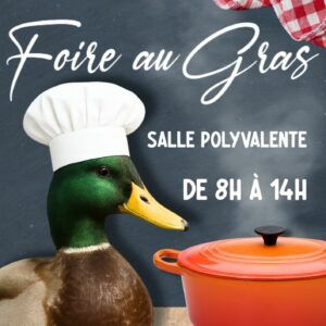𝗙𝗼𝗶𝗿𝗲 𝗮𝘂 𝗚𝗿𝗮𝘀 Dimanche 21 Décembre La foire au gras et son marché de producteurs fermiers ... 21 Déc 8h00 - 14h00 Salle Polyvalente