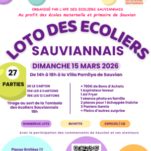 Super loto de Noël des Pétanqueurs Sauviannais Les Pétanqueurs Sauviannais vous invitent à leur Super Loto de ... 13 Déc 21h00 Salle Polyvalente